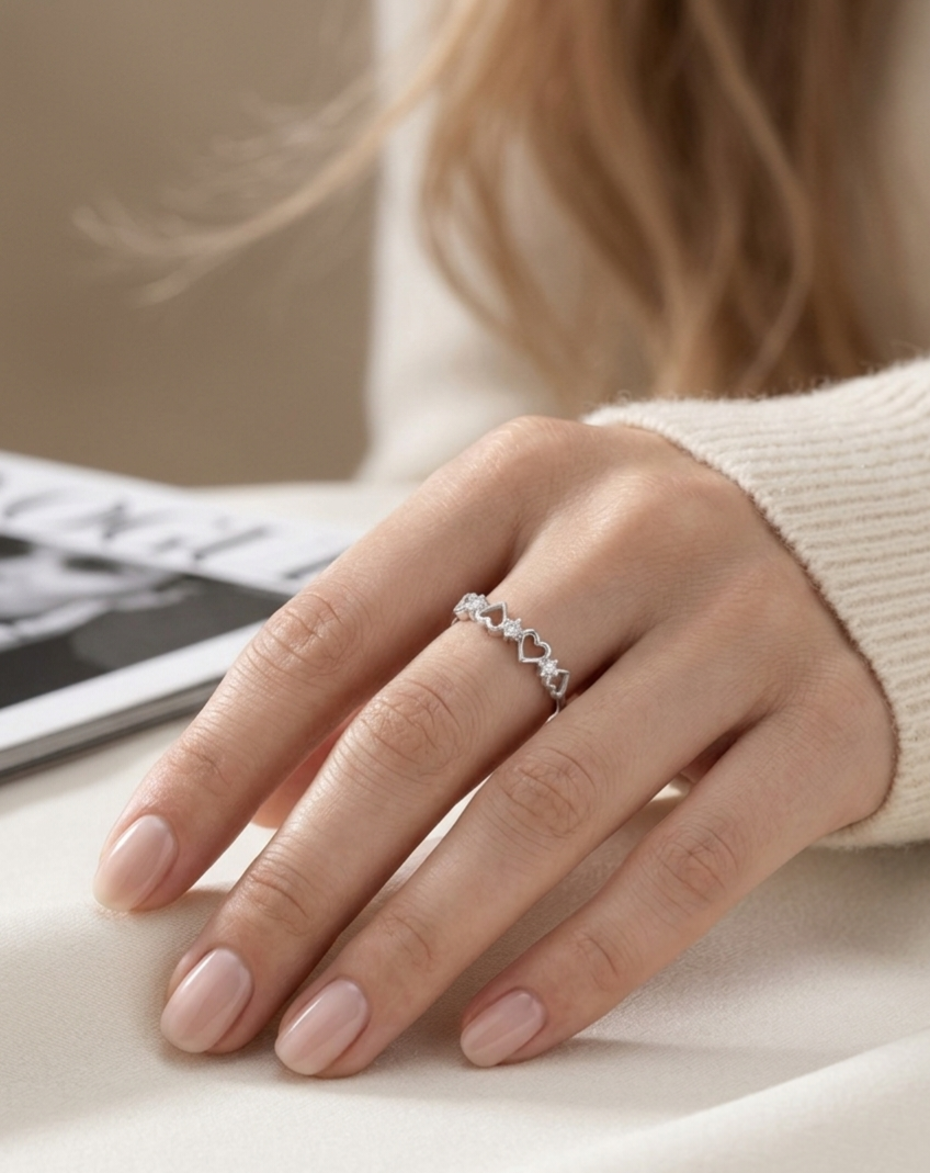 Este anel une um design delicado com a qualidade da Prata de Lei 925, garantindo brilho e durabilidade para o uso diário. Os corações vazados intercalados com zircônias trazem um toque de sofisticação e leveza a peça.