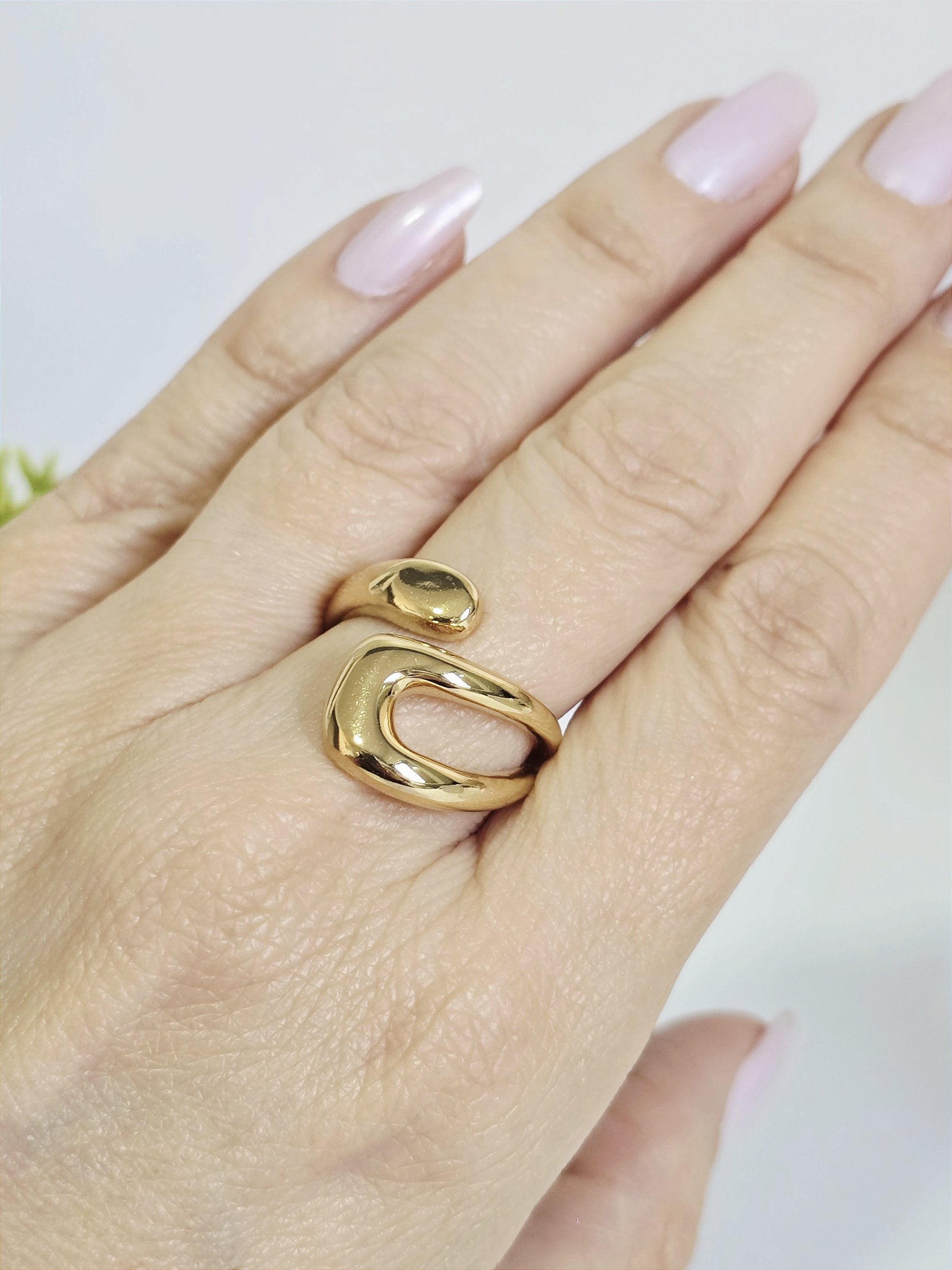 Com linhas modernas e design vazado, este anel ajustável em aço banhado a ouro é a escolha ideal para quem busca estilo e sofisticação. A forma orgânica traz um toque artístico, tornando-o um acessório único para qualquer ocasião. Pode ser levemente ajustado.