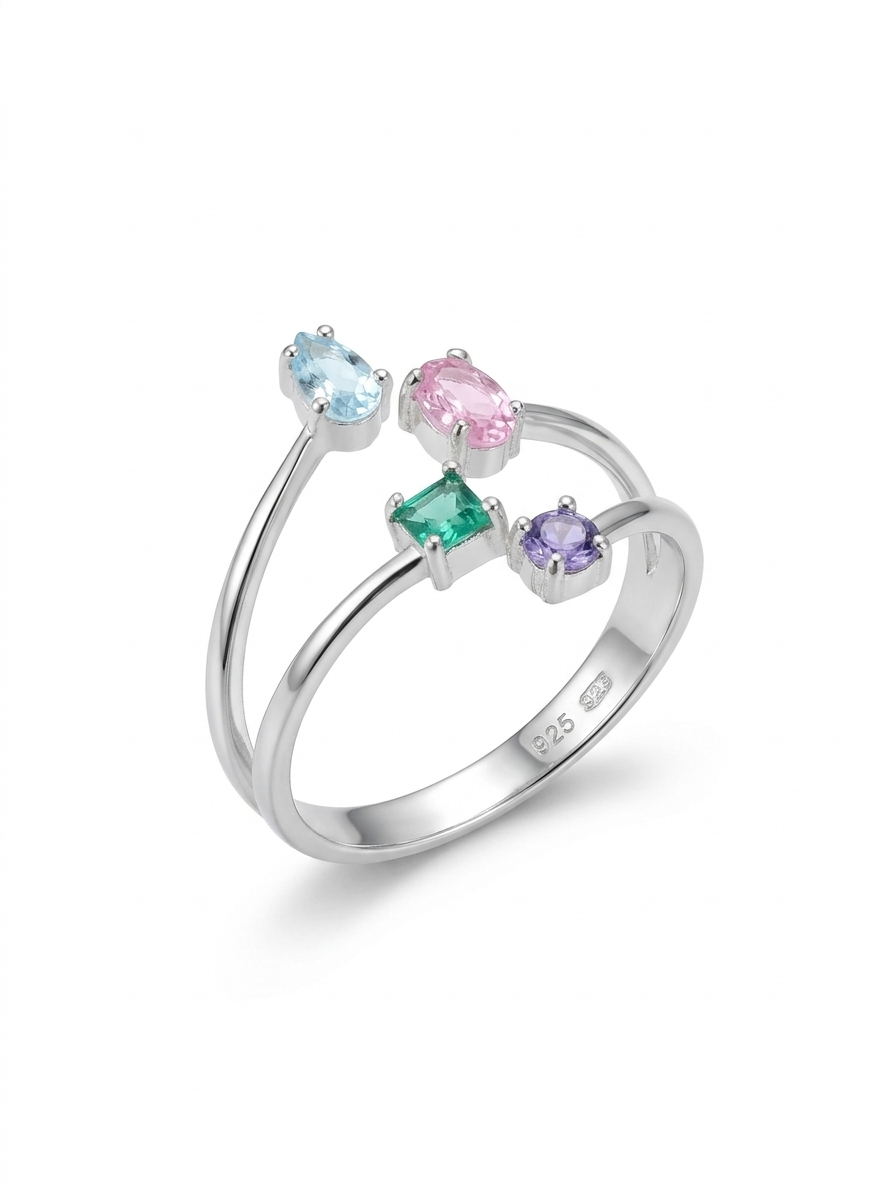 O anel é feito em prata 925, metal que oferece durabilidade e resistência ao desgaste do uso diário. As pedras coloridas são zircônias de lapidações variadas, que valorizam a peça com diferentes cortes e brilhos. Seu design aberto permite que o anel seja ajustado conforme o comprimento do dedo, entregando conforto e versatilidade sem perder o estilo.