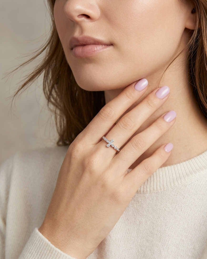 Confeccionado em Prata de Lei 925, o anel apresenta uma cruz central delicadamente cravejada com mini zircônias cristais, que garantem um brilho sutil e elegante a cada movimento. O grande diferencial está em seu aro trabalhado em esferas (estilo bolinhas), que confere uma textura única e um toque artesanal à peça.