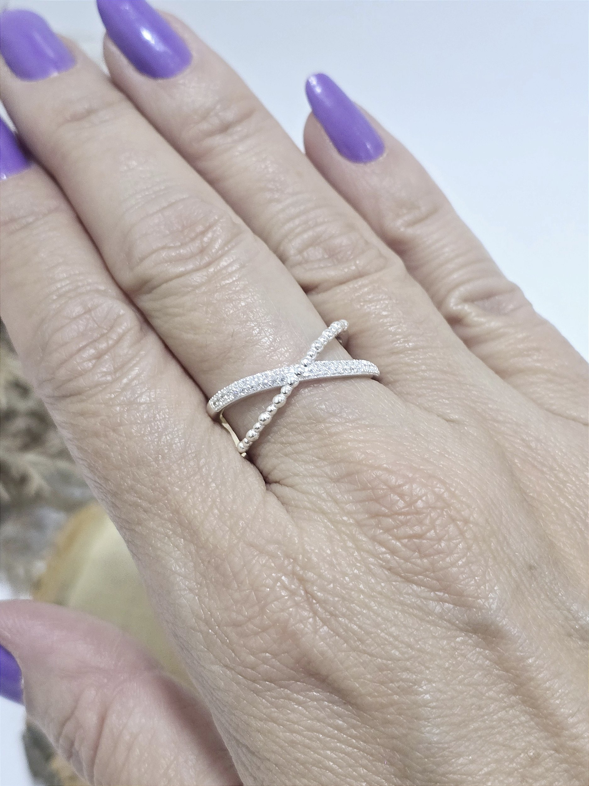 Este anel combina delicadeza e sofisticação em um design cruzado moderno. Confeccionado em Prata 925, apresenta duas faixas entrelaçadas: uma cravejada de zircônias brilhantes e outra com acabamento em esferas polidas, criando um contraste elegante e atemporal. Perfeito para destacar seu estilo em qualquer ocasião.