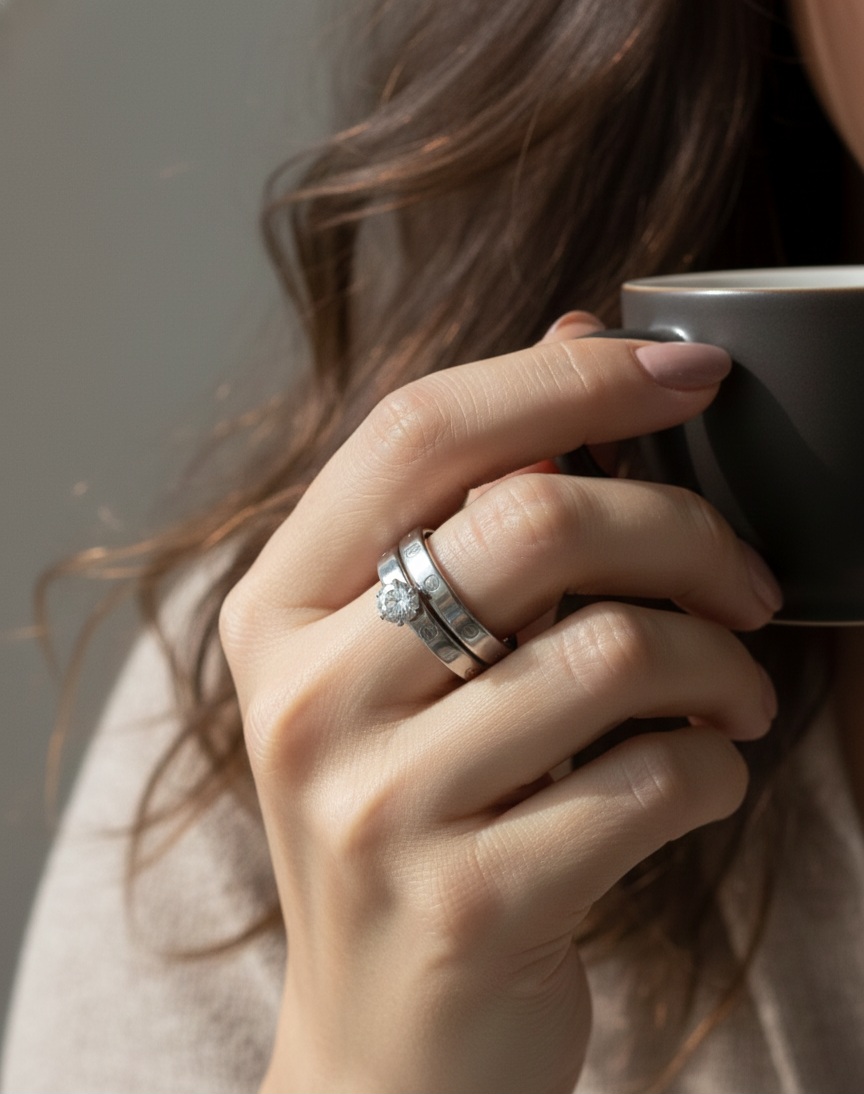 O Anel Duplo com Solitário em Aço Inoxidável é a combinação perfeita de elegância e brilho em uma única peça. Com design moderno que une duas argolas — sendo uma lisa com detalhes e outra com solitário central de alta luminosidade — ele traz sofisticação sem excessos e valoriza qualquer look, do casual ao clássico.