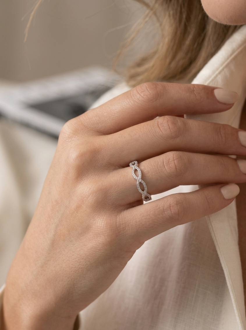 Esta joia fina apresenta um visual delicado e geométrico, ideal para quem busca um acessório que alia modernidade e tradição. O anel tem acabamento que realça as zircônias entre os elos, trazendo um brilho intenso e elegante. Por ser em prata de alta qualidade, mantém o visual por mais tempo, exigindo cuidados básicos para conservar seu brilho, como evitar exposição a produtos químicos e limpeza adequada.