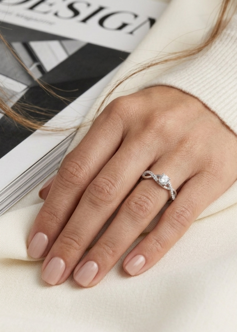 Confeccionado em Prata de Lei 925, uma das hastes é delicadamente cravejada com microzircônias, trazendo um brilho extra que emoldura o solitário central. É uma peça que une a delicadeza de um anel de noivado com a modernidade de uma joia de design orgânico.