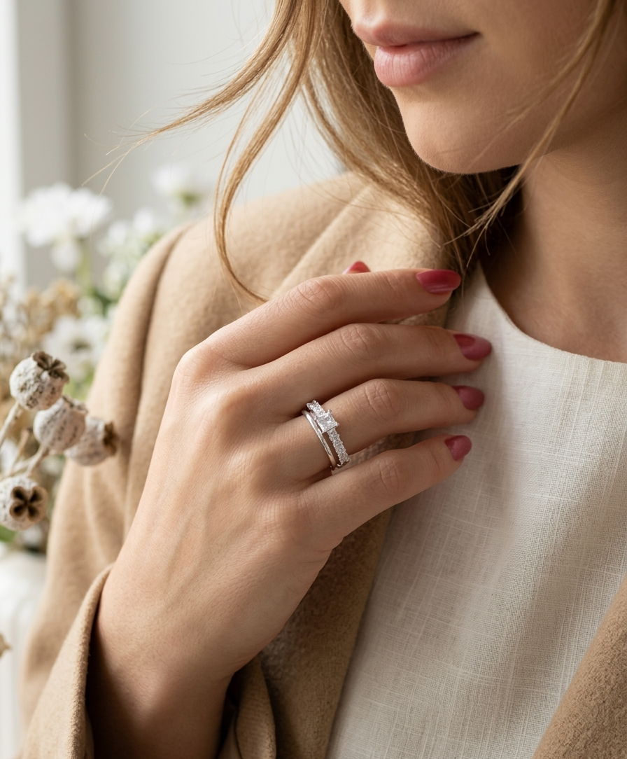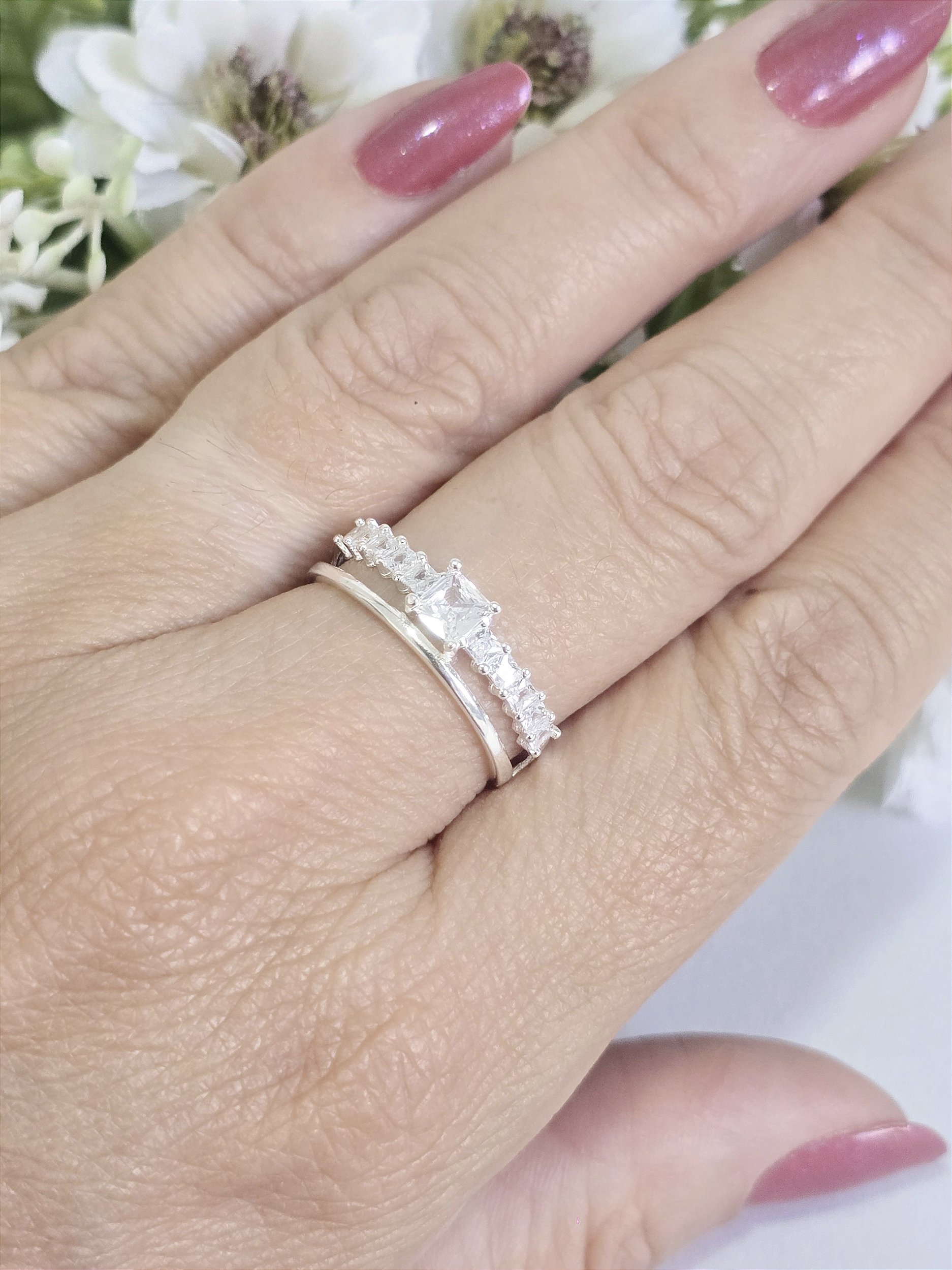 Anel Luxo Duplo com Solitário Quadrado e Zircônias em Prata 925