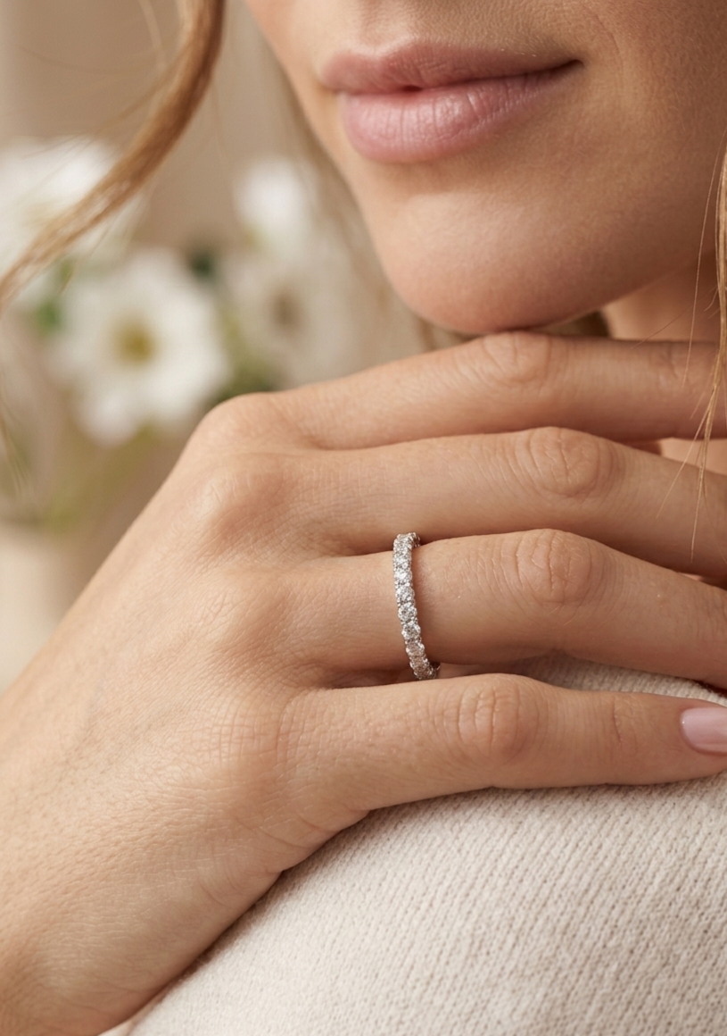 Este anel combina a pureza da prata 925 com o brilho elegante das zircônias. Seu design minimalista apresenta um aro fino cravejado na metade com pedras brilhantes, criando um efeito sofisticado sem perder a delicadeza. Ideal para quem busca uma joia clássica para usar no dia a dia ou em ocasiões especiais.