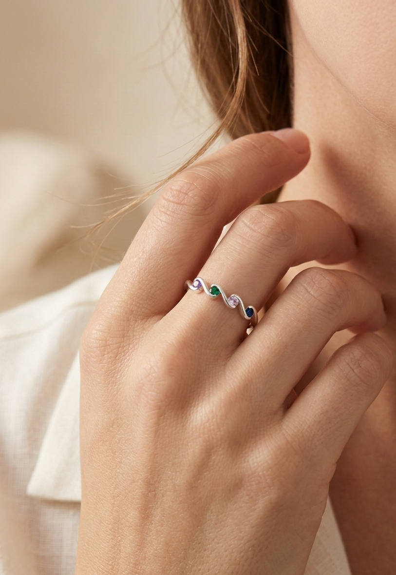Vibrante, moderno e cheio de movimento — o Anel Ondas Coloridas em Prata 925 é a peça perfeita para quem ama acessórios que expressam personalidade e alegria. O design apresenta um aro com silhueta sinuosa em ondas, cravejado com quatro cristais coloridos em tons de safira, rosa, esmeralda e ametista.