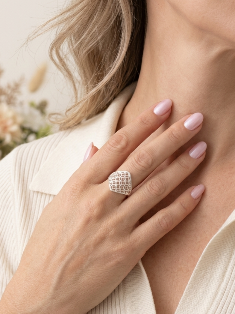 O Anel Renda Moderna em Prata 925 combina leveza e sofisticação em um design inspirado na delicadeza dos rendados. Seu formato vazado cria um efeito visual elegante e contemporâneo, valorizando a textura e o brilho natural da prata.