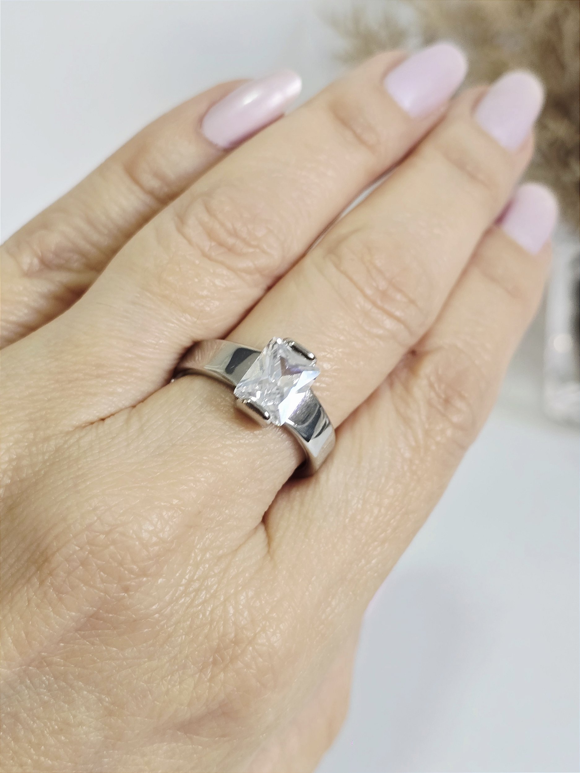 Anel Solitário com Zircônia Retangular em Aço Inoxidável