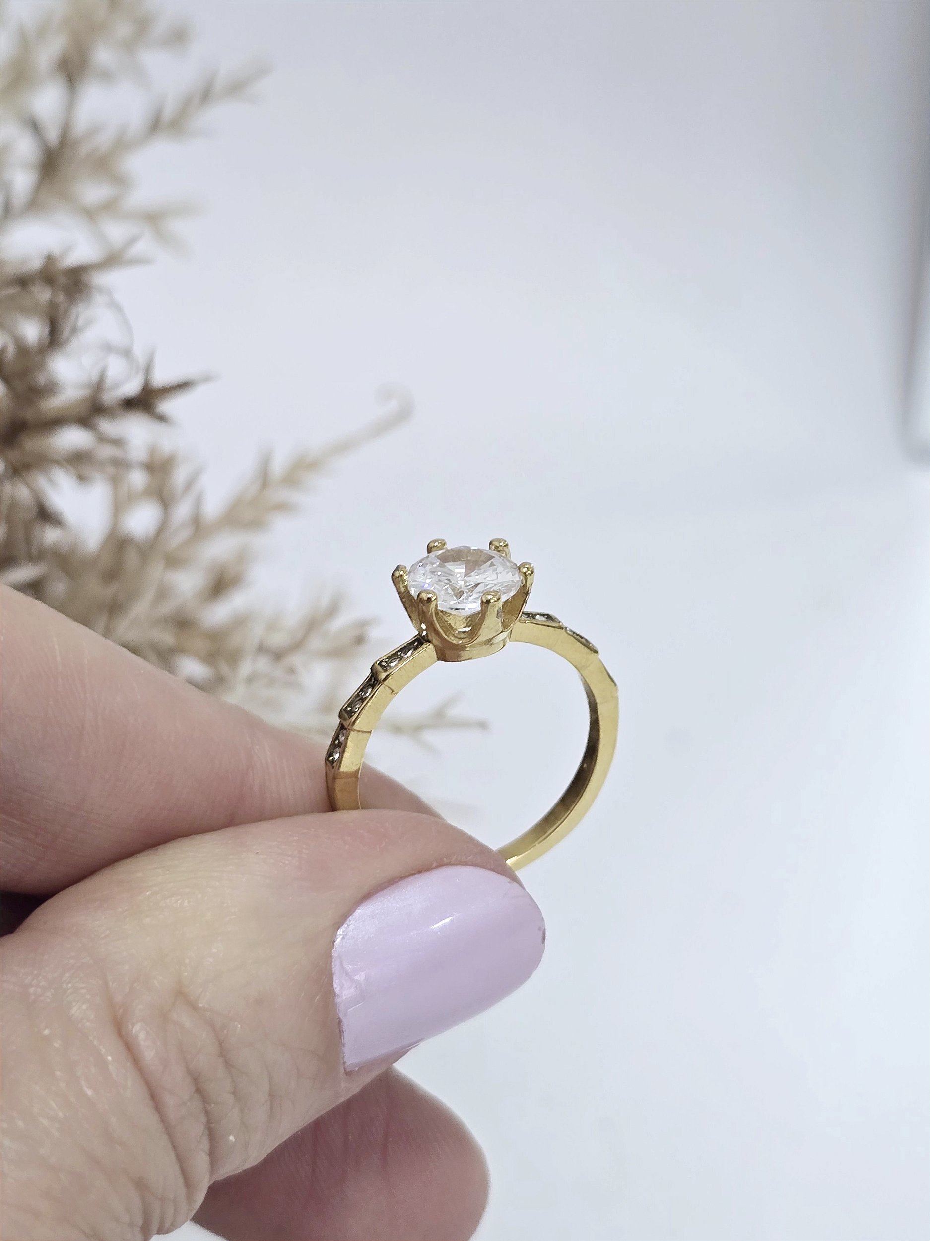 Anel Solitário Luxo em Aço Inoxidável Banhado a Ouro