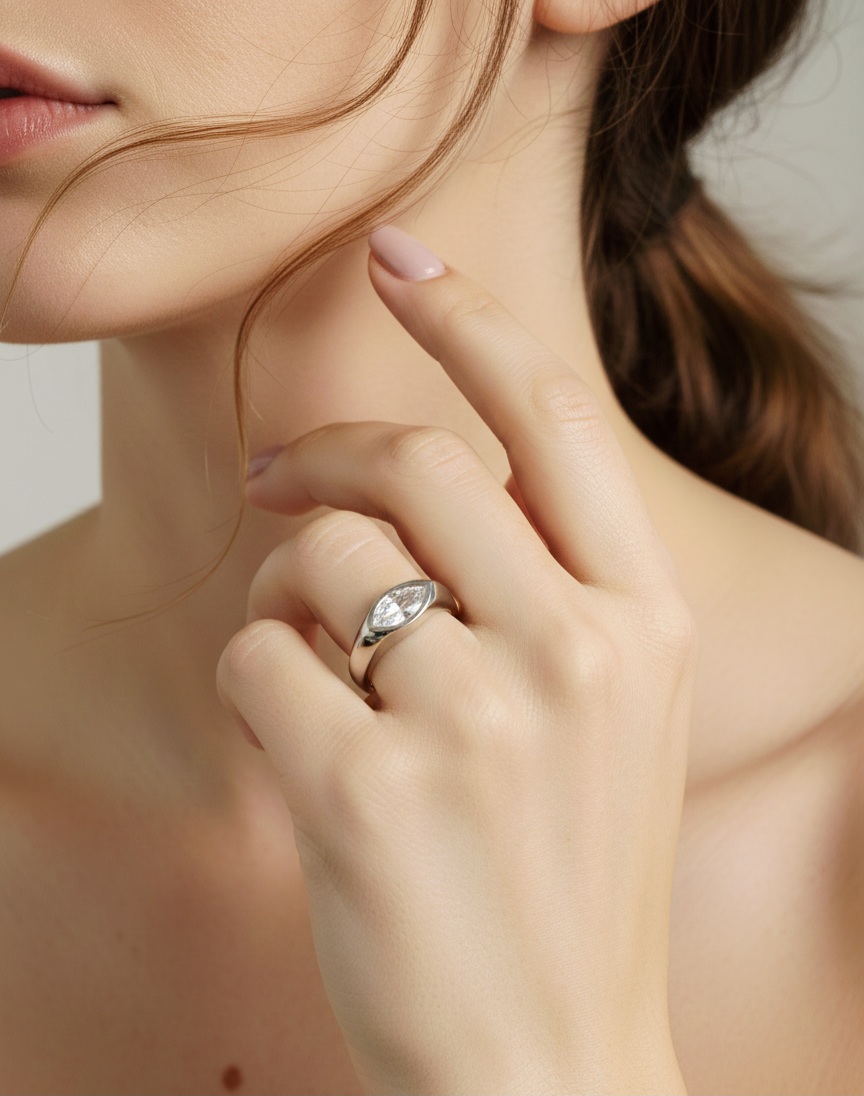 O Anel Solitário Oval em Aço Inoxidável é a escolha perfeita para quem busca elegância com brilho marcante. Seu design moderno com pedra central oval destaca a joia com sofisticação, sendo a peça ideal para usar no dia a dia ou em produções mais refinadas.