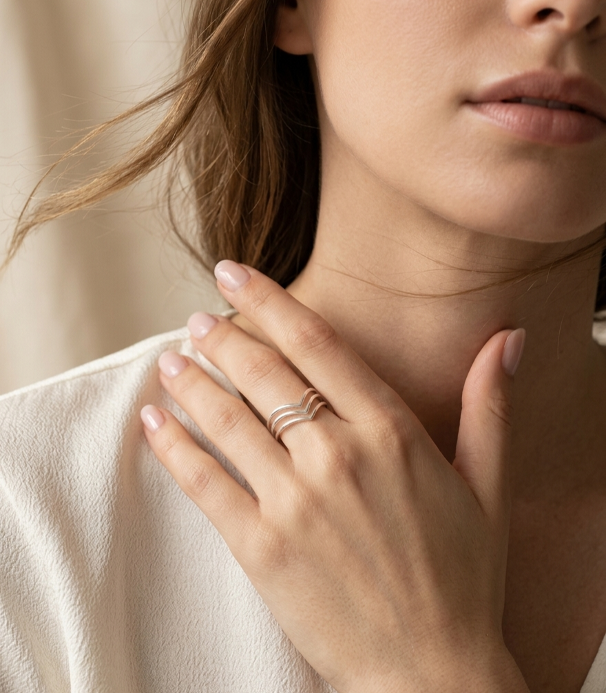 O design que transforma o seu mix de joias. O nosso Anel Chevron Triplo em Prata 925 une o estilo minimalista a uma presença marcante. Com três aros delicados que se unem em um formato de "V" perfeito, esta peça cria um efeito visual de camadas, garantindo um toque moderno e arquitetônico ao seu visual.