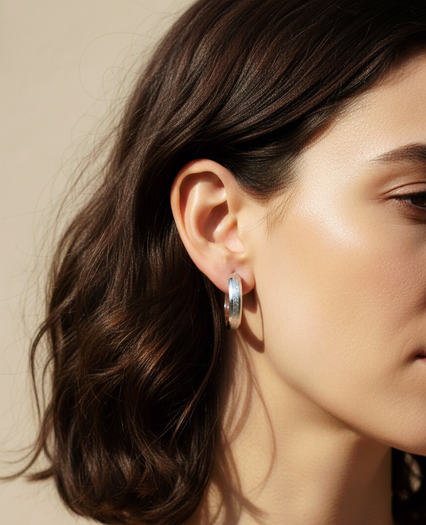 Esta argola combina o brilho clássico com a modernidade do acabamento misto. Seu design de espessura média apresenta um acabamento polido na borda, realçado por duas finas listras centrais com textura fosca (escovada/acetinada), criando um contraste elegante e discreto que confere personalidade à peça.