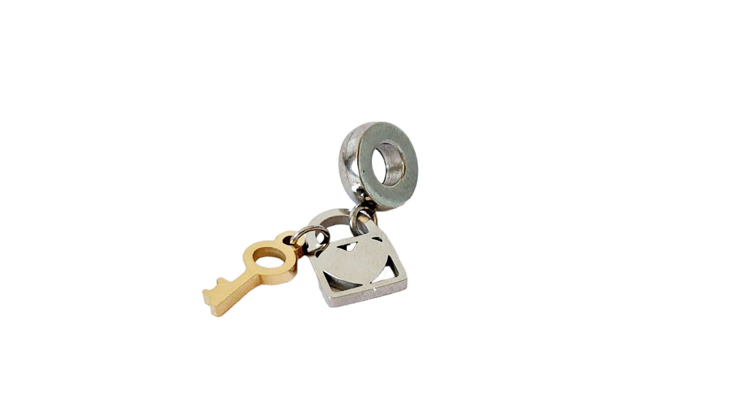 Berloque Cadeado Coração e Chave Dourada, Aço Inoxidável