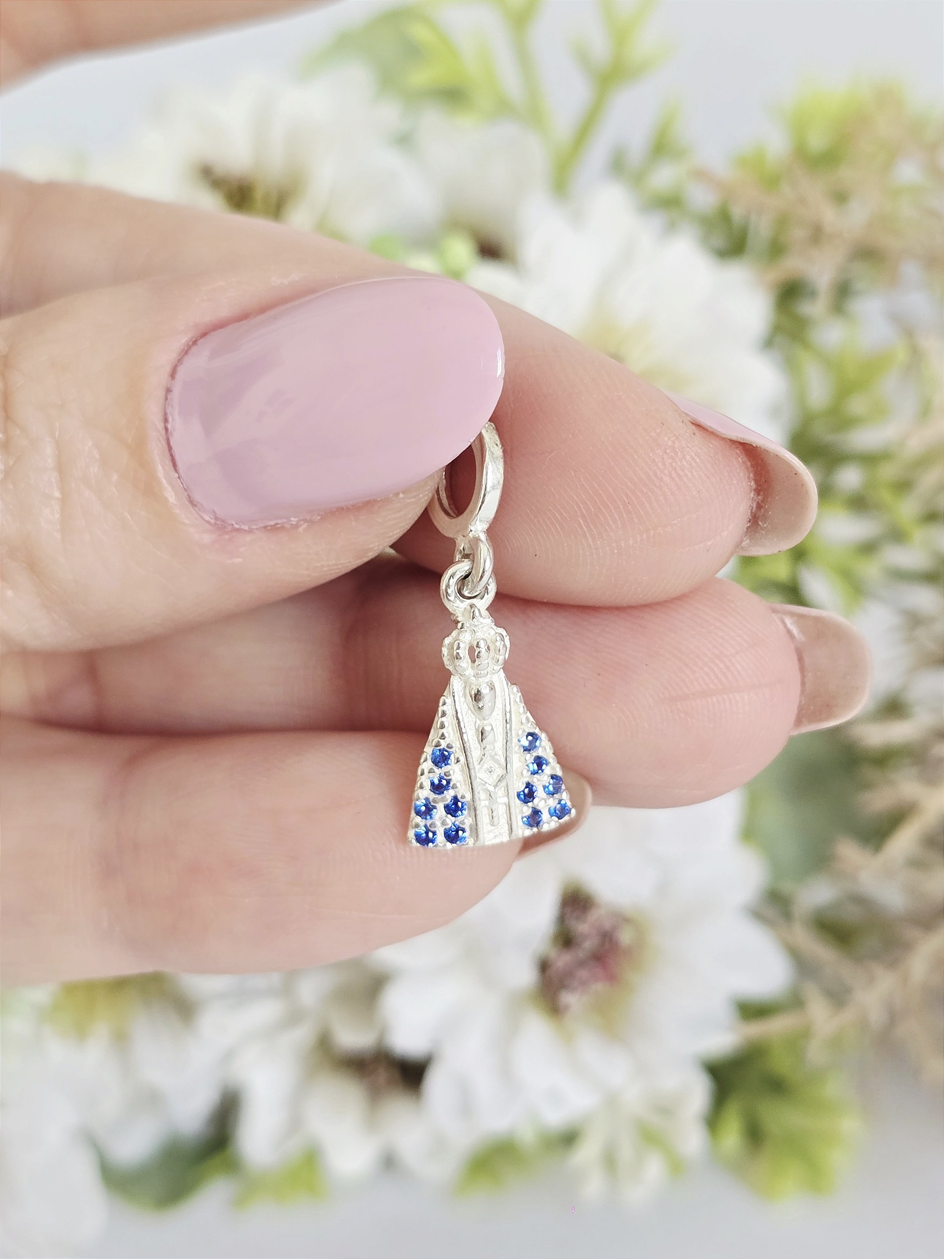 Berloque Nossa Senhora Aparecida em Prata 925 com Zircônias Azuis, uma joia de fé e devoção que transmite proteção e espiritualidade. Com detalhes delicados e acabamento de alto brilho, é perfeito para compor pulseiras personalizadas que carregam significado.