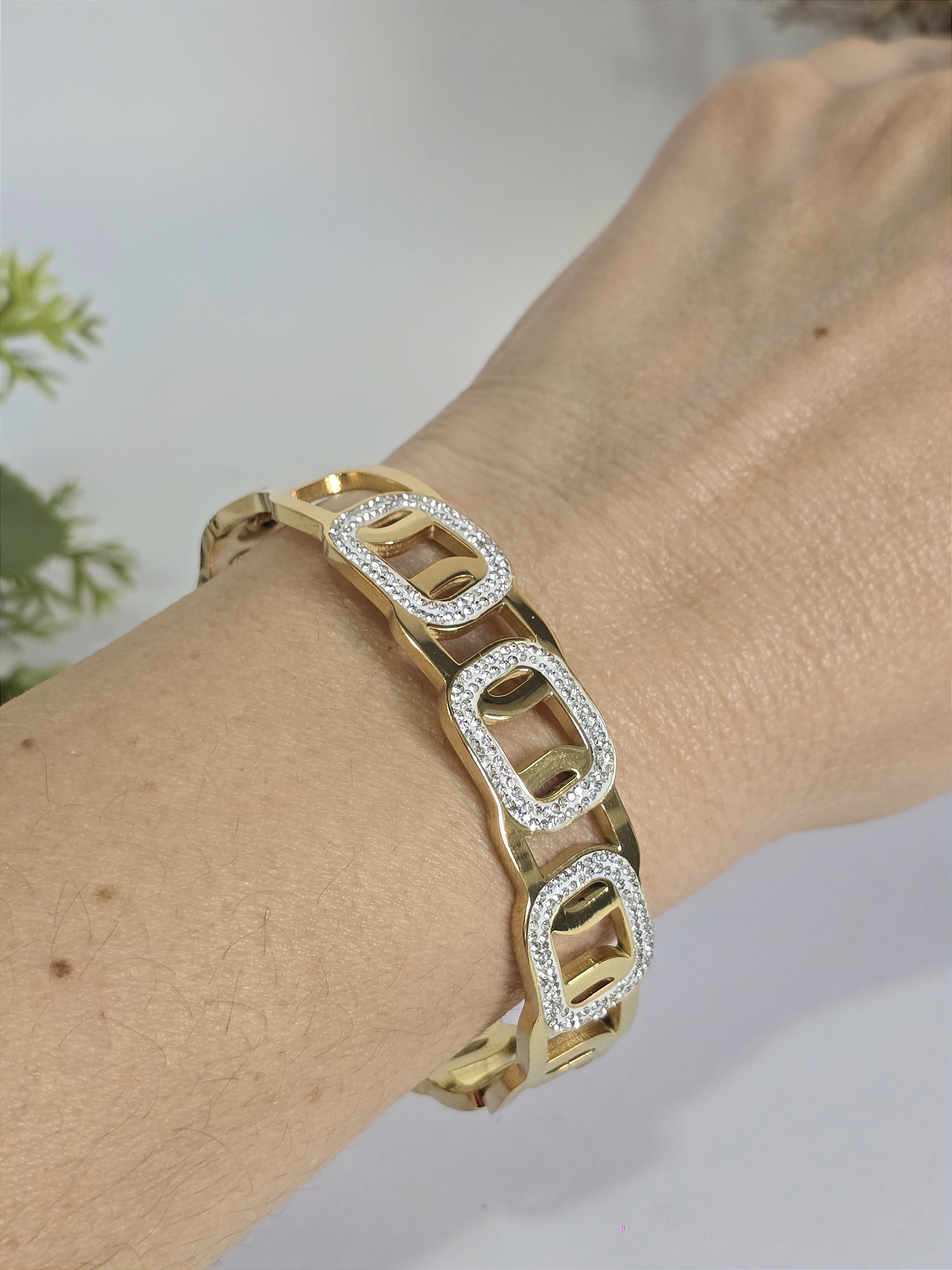 Moderno e sofisticado, o Bracelete Elos em Aço Inoxidável Banhado a Ouro traz um design marcante que une estilo e elegância. Seus elos destacados recebem aplicações de zircônias cravejadas, proporcionando um brilho refinado que transforma qualquer produção. Uma peça versátil que pode ser usada sozinha como protagonista ou combinada com outros acessórios para um visual ainda mais imponente.