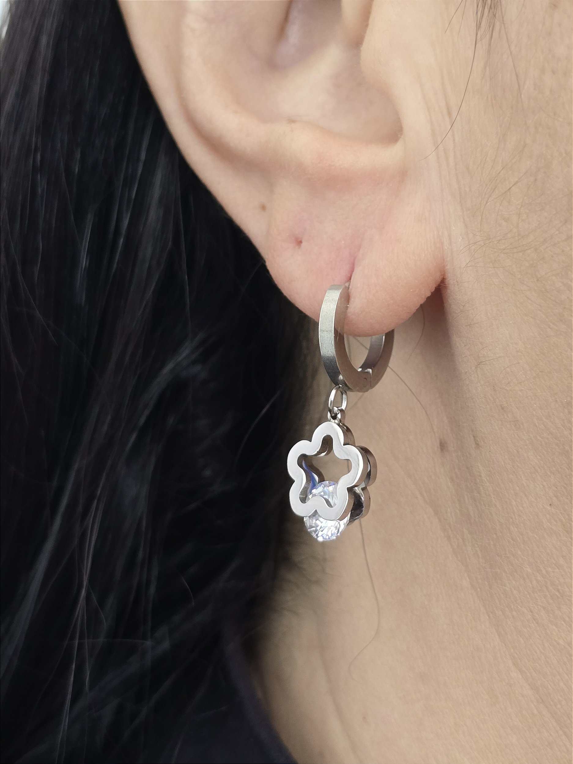 Brinco Argola Click com Pingente de Flor em Aço Inoxidável, com um lindo cristal no centro que dá todo o charme parfa essa peça.