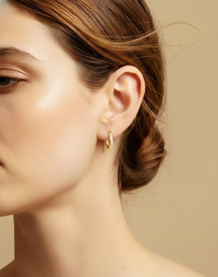 O Brinco Argola Cravejada é um acessório da nossa Linha Premium, projetado para máximo conforto e brilho. Com um perfil arredondado e acabamento de alta joalheria, esta argola é delicadamente cravejada com micro zircônias. O fecho click seguro a torna ideal para o uso contínuo, no primeiro ou segundo furo.