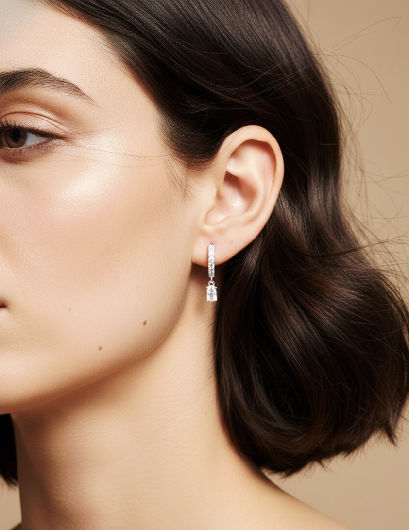 O Brinco Argolinha Cravejada com Pingente Retangular em Prata 925 combina delicadeza e sofisticação em uma peça luminosa. A argolinha possui micro zircônias que proporcionam um brilho sutil e elegante, enquanto o pingente retangular acrescenta movimento e um toque moderno ao look.