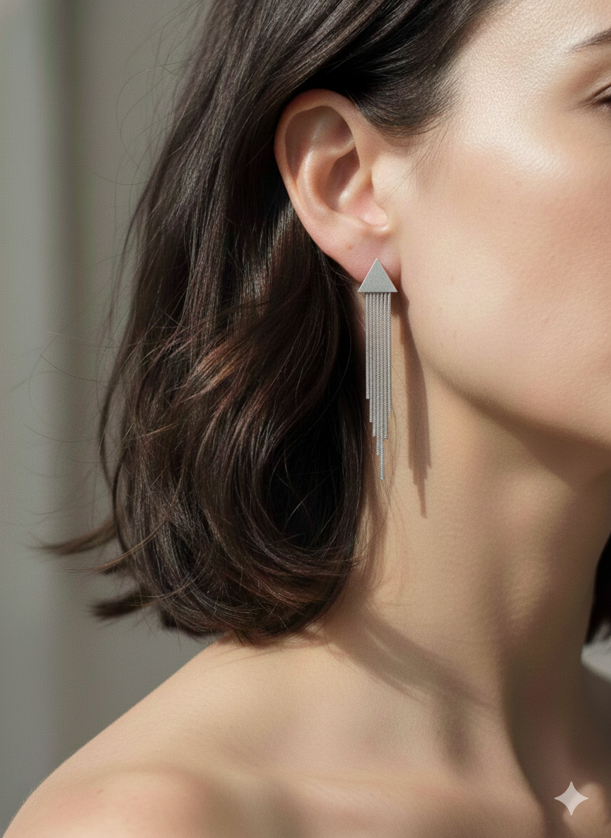 Este brinco combina o moderno com o dramático, resultando em uma peça de impacto e sofisticação. O design começa com um triângulo liso e polido na parte superior, que serve como base no lóbulo, e se estende em uma cascata de finas correntes (franjas).