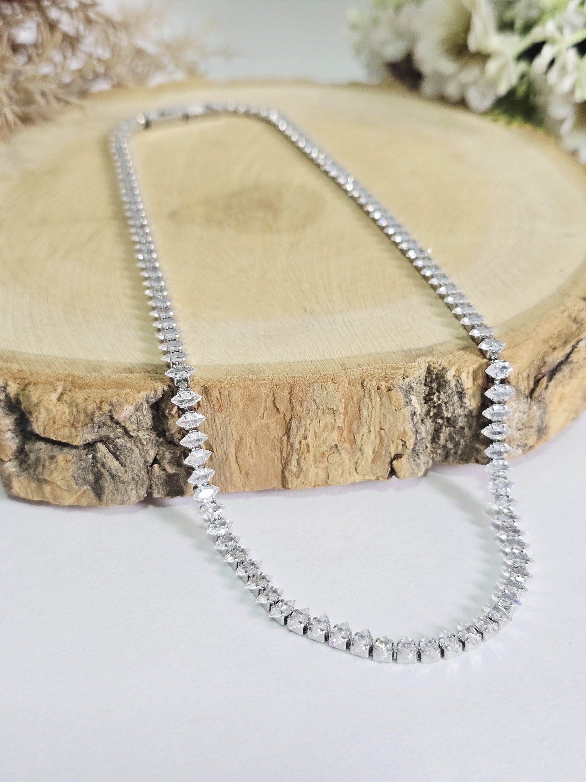 Choker Riviera em aço inoxidável com zircônias lapidação navete, que iluminam o pescoço com sofisticação e brilho intenso. Produzida em aço inoxidável de alta qualidade, esta peça não oxida, não perde a cor nem o brilho e é totalmente hipoalergênica, garantindo conforto e durabilidade. Um acessório atemporal que combina delicadeza e elegância, perfeito para ocasiões especiais ou para elevar o estilo no dia a dia.