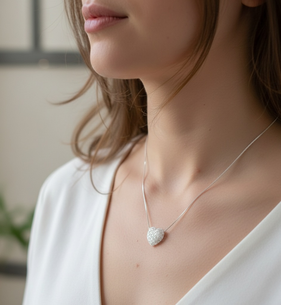 O Colar Coração Rendado é uma peça que combina romantismo e o charme do trabalho detalhado. O pingente em formato de coração se destaca pelo seu design vazado e intrincado, que lembra uma delicada renda, criando uma textura leve e sofisticada. Esse trabalho minucioso confere à joia um visual etéreo e de grande apelo visual.