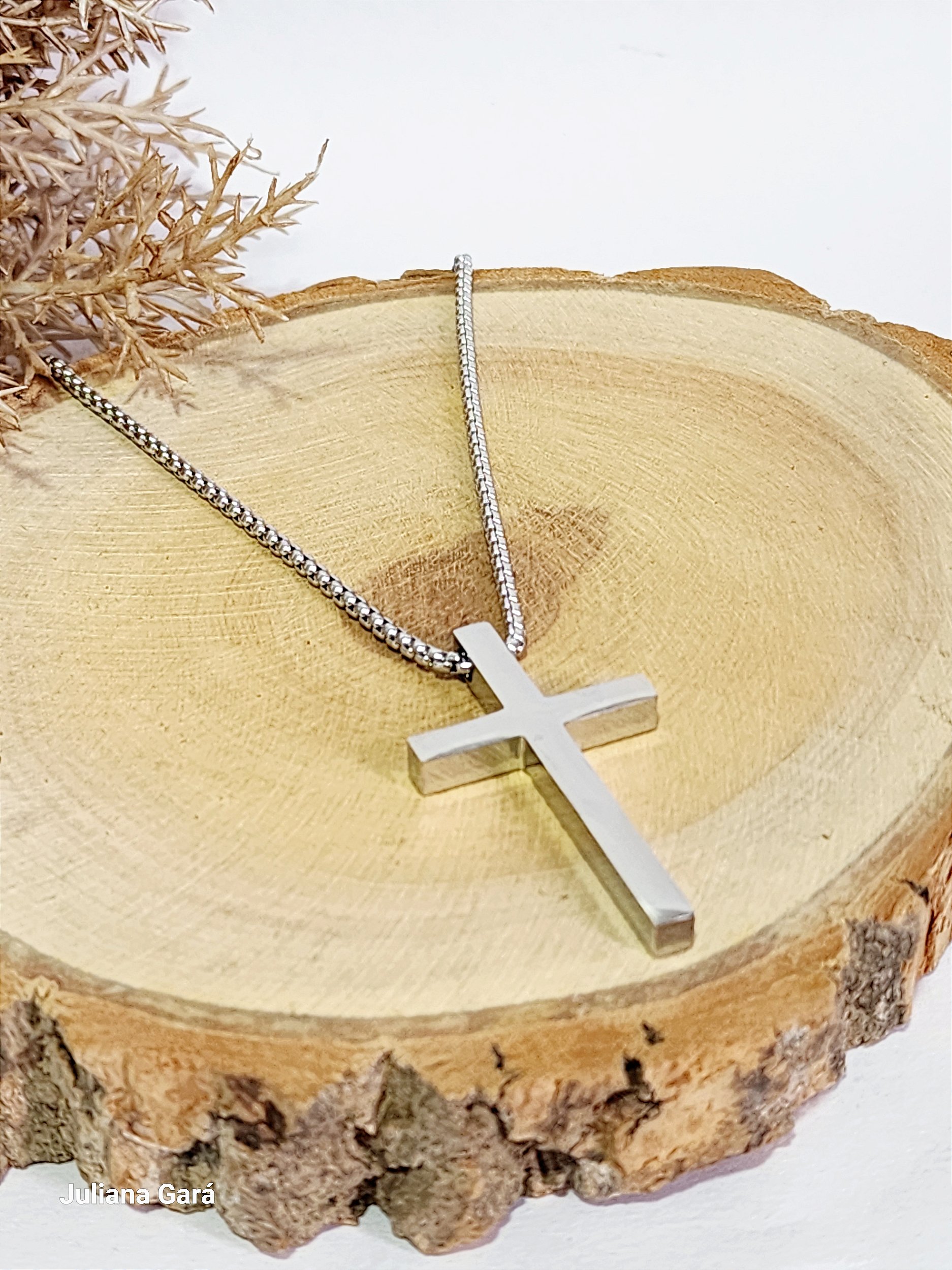 Colar Cruz Quadrada, Robusta, em Aço Inoxidável - Corrente Piopca de 70 cm - Pingente de 5 cm x 5 mm