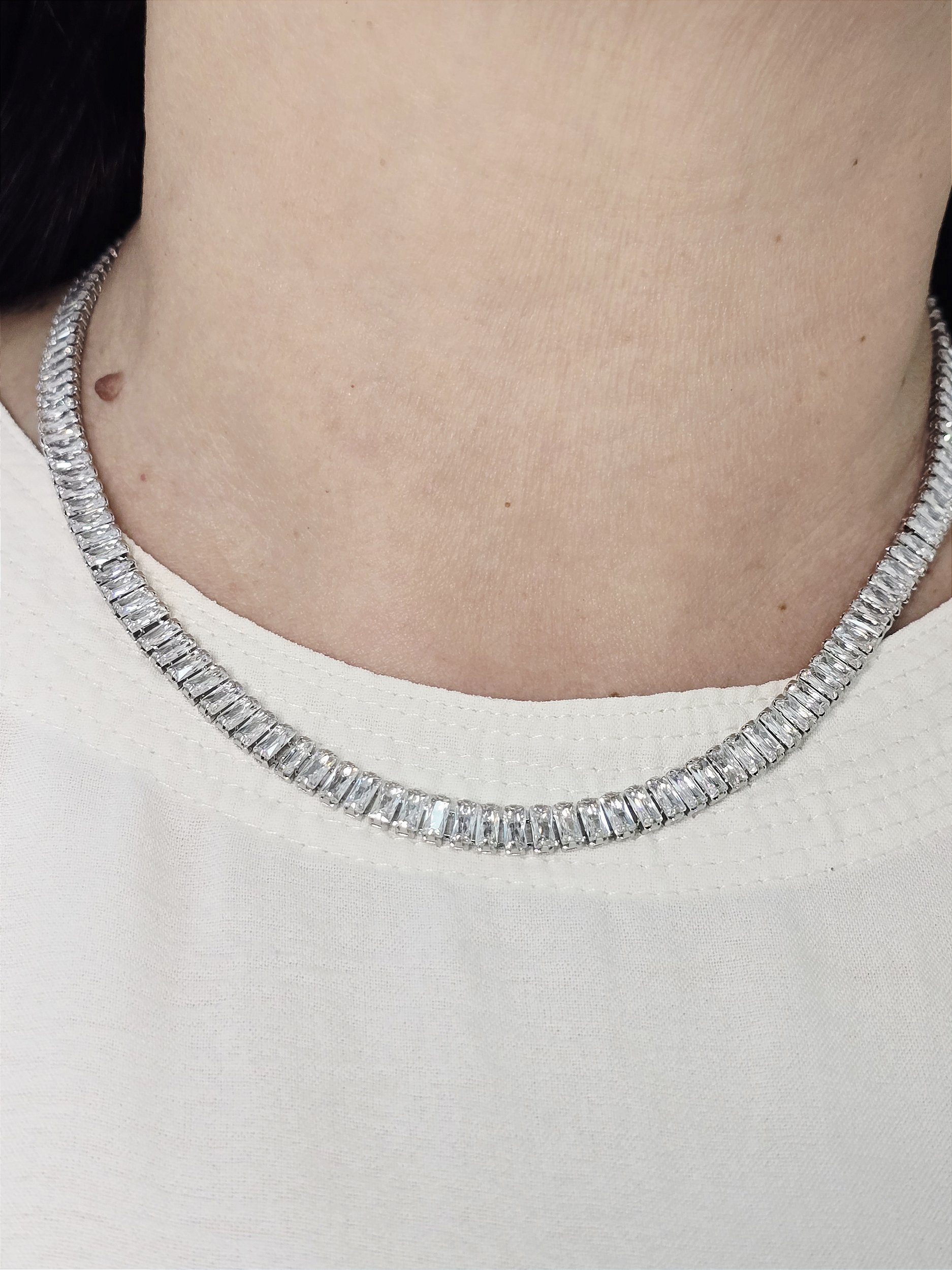 Colar em aço inoxidável de alta qualidade, cravejado com zircônias em corte baguete que garantem brilho intenso e sofisticação. Resistente e hipoalergênico, é a escolha perfeita para ocasiões especiais ou para transformar o look do dia a dia com elegância.