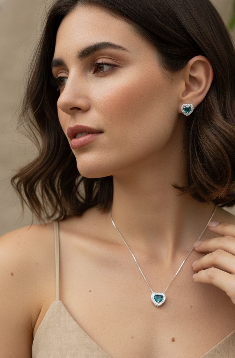 Detalhes: Zircônia central em formato de coração cravejada em halo (Colar e Brincos).