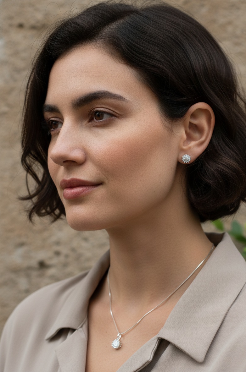 O Conjunto Ponto de Luz Cravejado é sinônimo de elegância e brilho atemporal. O pingente do colar e os brincos são formados por um cluster de micro zircônias que, juntas, criam a ilusão de um ponto de luz maior e mais cintilante, realçando o rosto e o colo.