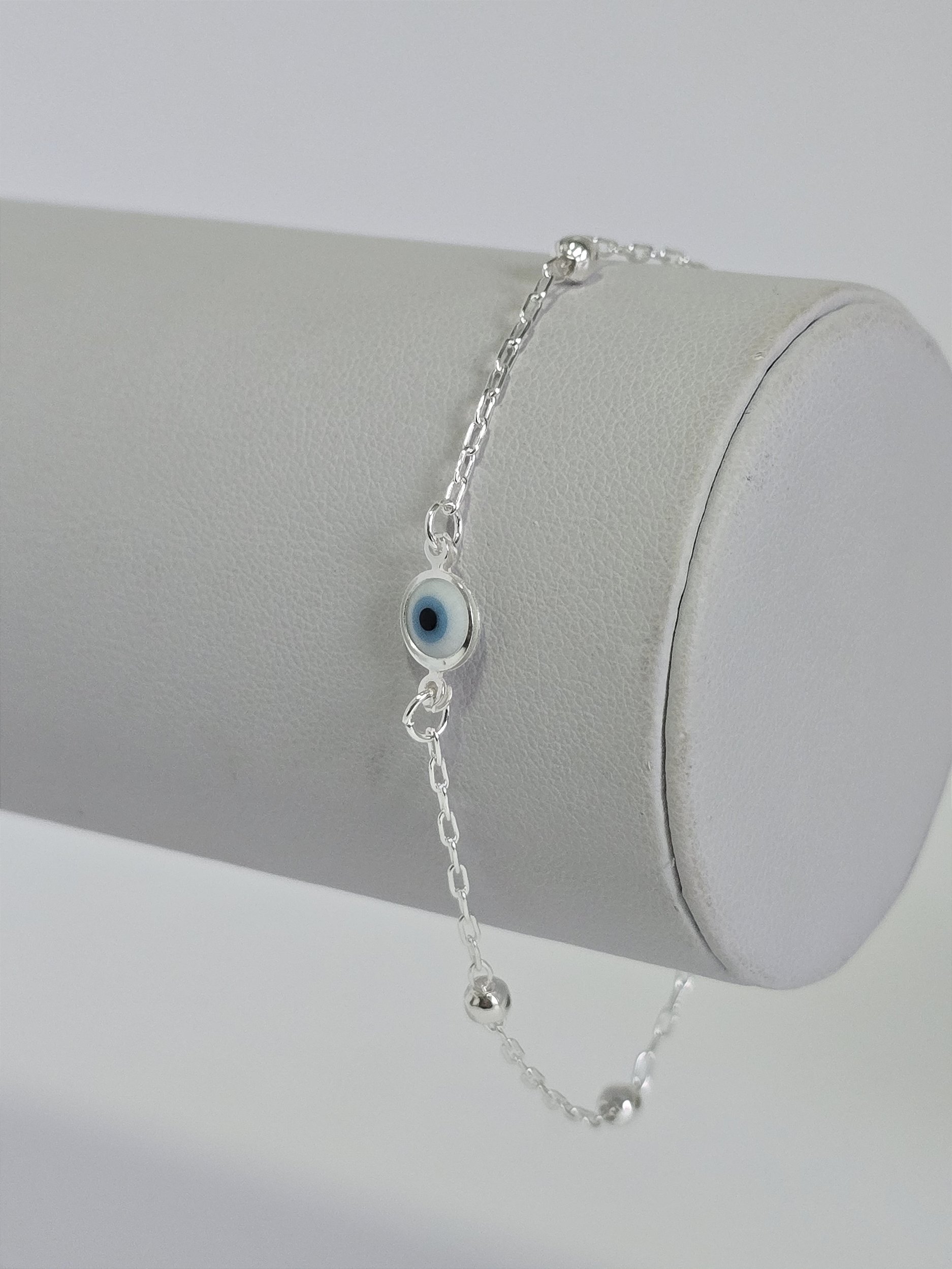 A Pulseira de Bolinhas Olho Grego combina proteção, significado e delicadeza em uma joia de Prata 925 autêntica. O charm central do Olho Grego atua como um poderoso talismã contra o mau-olhado, enquanto a corrente fina, com bolinhas prateadas intercaladas, confere um toque minimalista e charmoso ao pulso.
