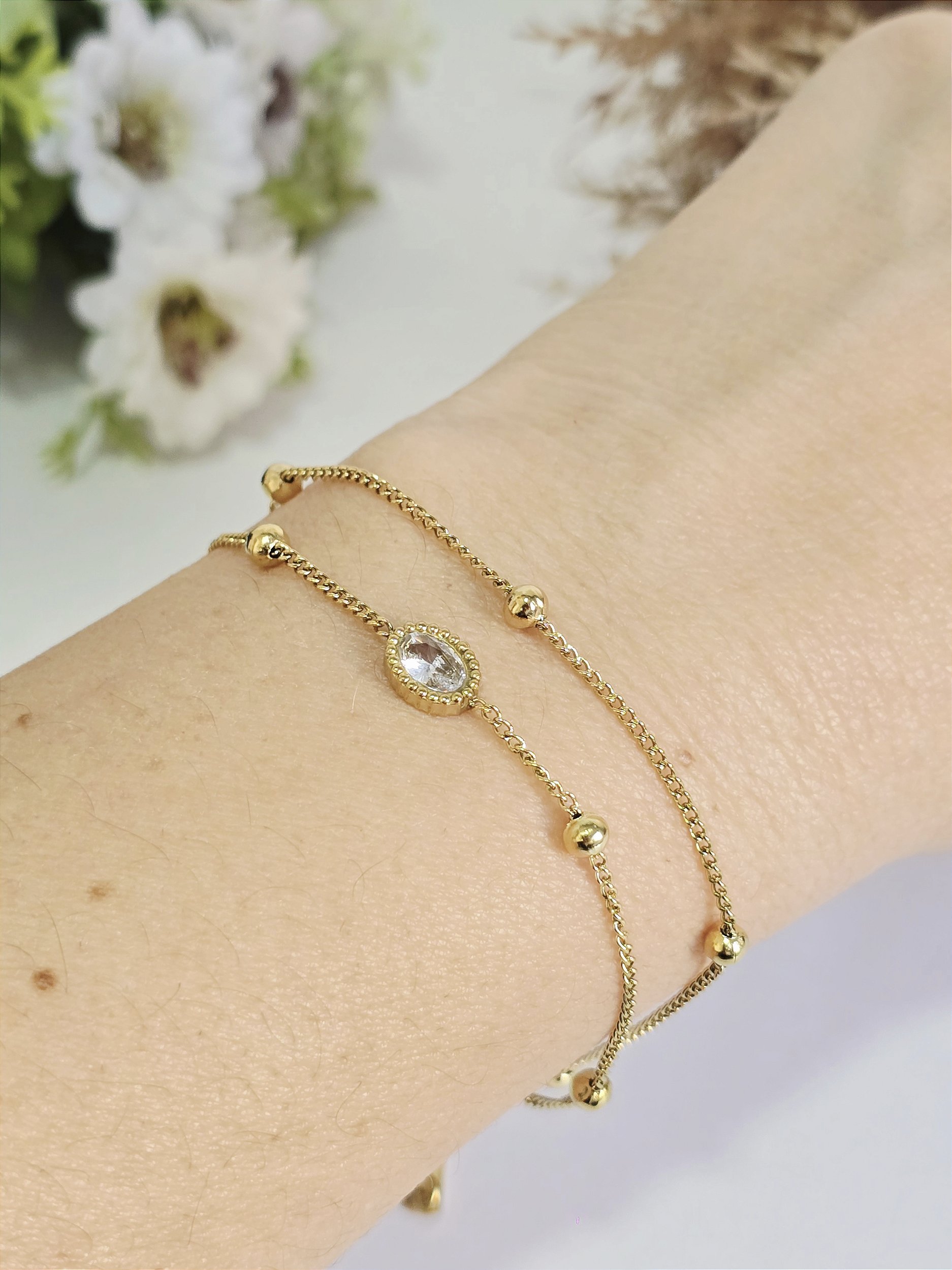 Pulseira Dupla Bolinhas e Ponto de Luz em Aço Banhado a Ouro. em aço inoxidável, banhado a ouro,não causam alergias e tem uma excelente durabilidade.