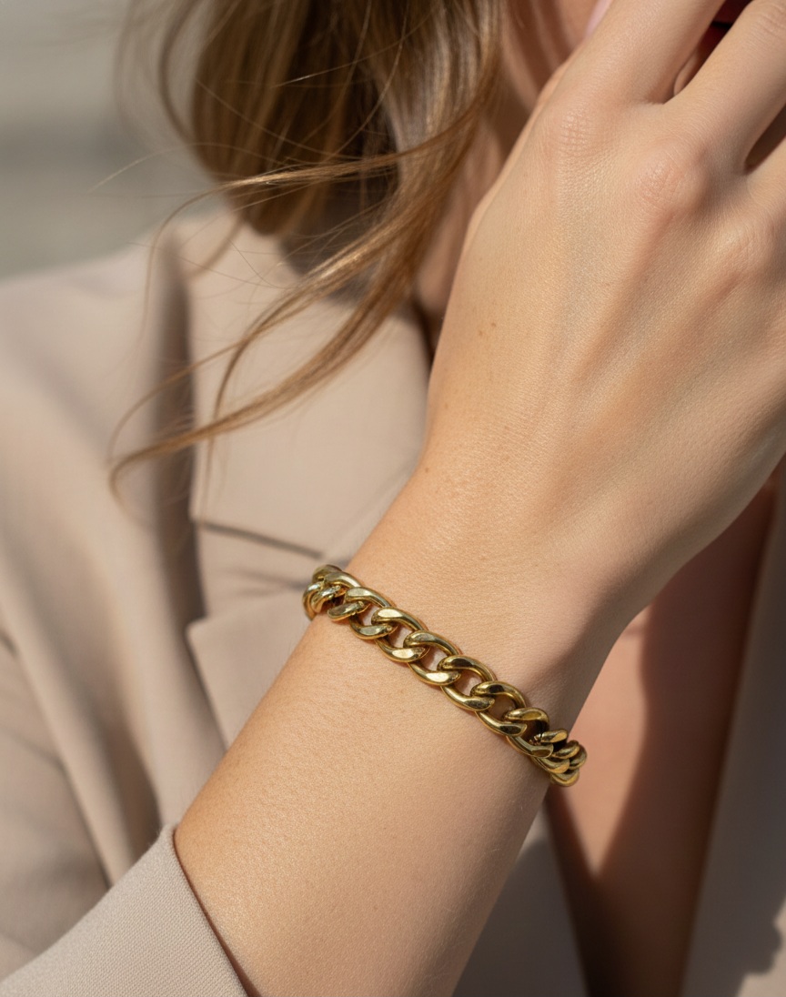 Fabricada em Aço Inoxidável, a pulseira recebe um acabamento de Banho a Ouro de alta qualidade, garantindo não apenas um visual luxuoso, mas também máxima durabilidade, sendo hipoalergênica e resistente ao desgaste diário. Seu design robusto e polido é ideal para ser usada sozinha como ponto focal ou em mixes com pulseiras mais finas.