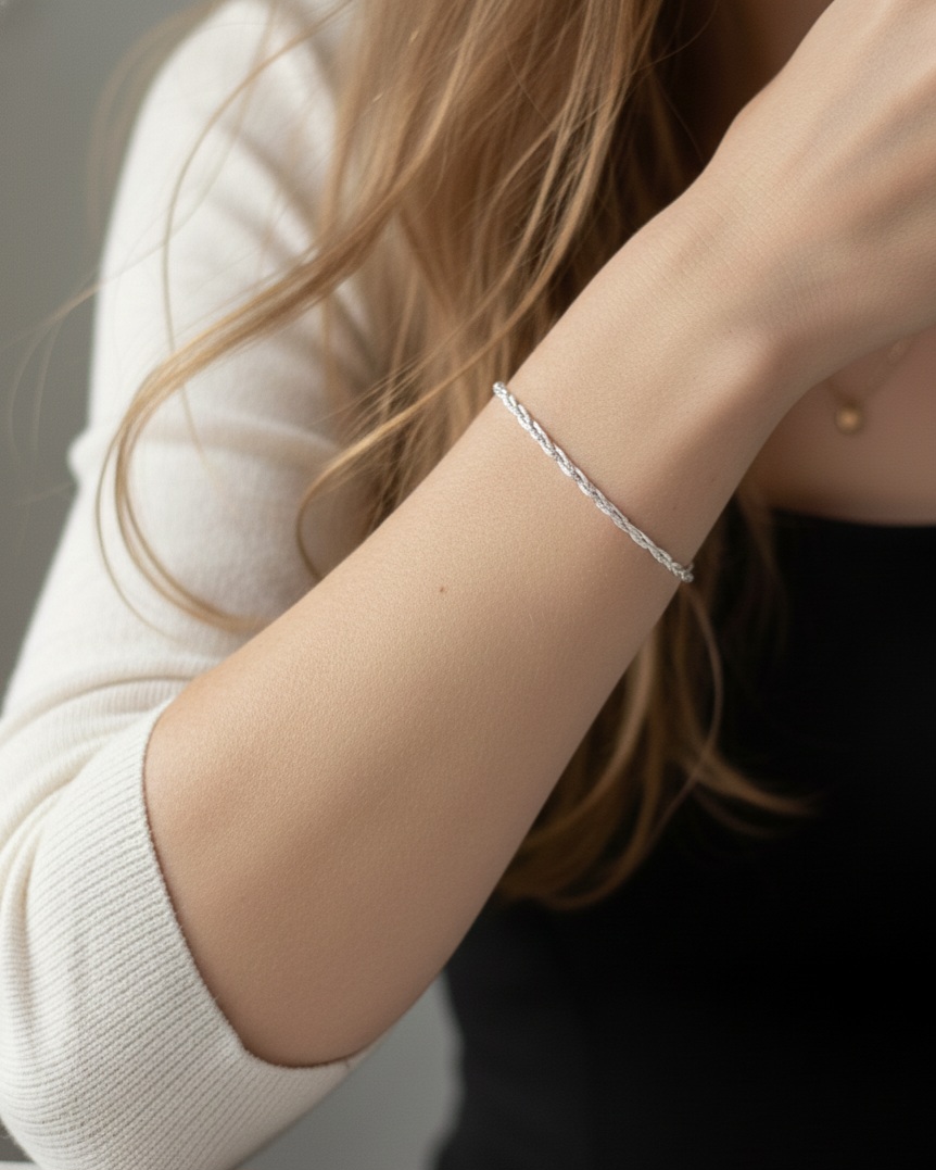 A Pulseira Trançada de Fios (também conhecida como modelo "Cordão Baiano") é uma joia elegante que se destaca pela sua textura e brilho. Sua estrutura é formada por dois ou mais fios finos que são entrelaçados, criando um efeito de corda com alto brilho.