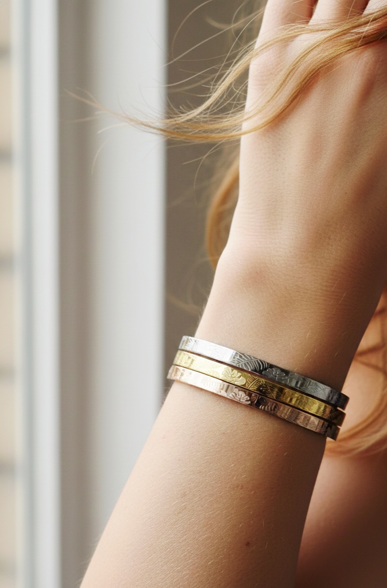 O Trio de Braceletes Rígidos é um kit essencial para criar um pulso sofisticado e moderno. O conjunto é composto por três pulseiras rígidas com designs distintos: uma lisa e polida, uma fina com detalhes em alto relevo e uma com textura marcante, permitindo que você combine ou use as peças separadamente.