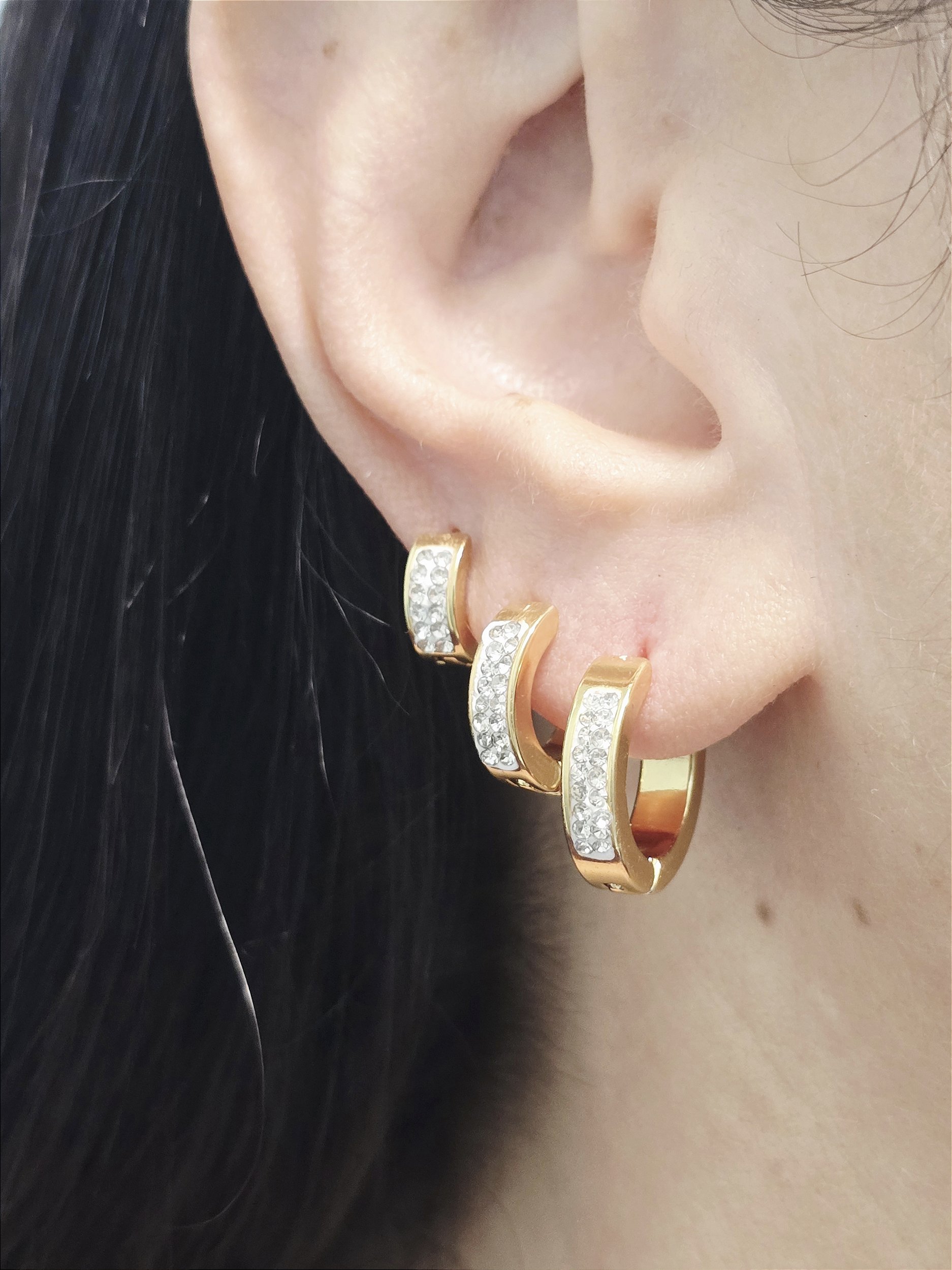 O Trio de Brincos Argolinhas Cravejadas em Aço Inoxidável Banhado a Ouro é a escolha perfeita para quem ama brilho e sofisticação em dose tripla. Com três tamanhos diferentes, o conjunto permite composições elegantes e modernas — ideais para quem tem múltiplos furos ou gosta de variar o visual.